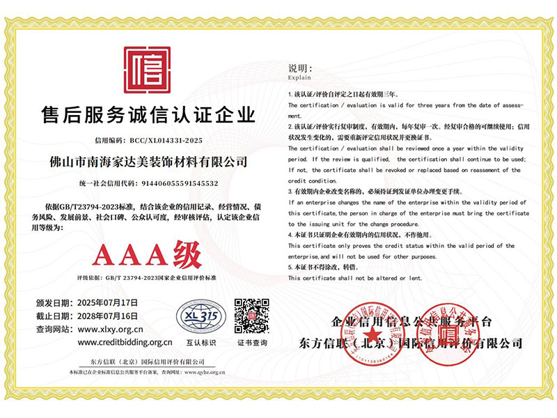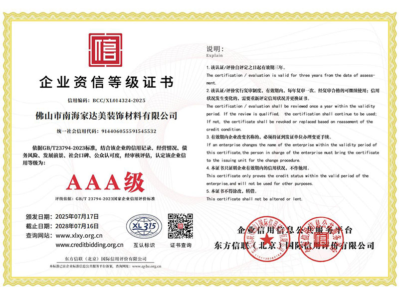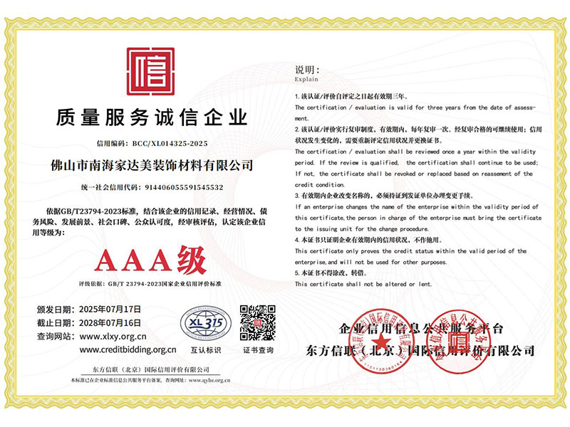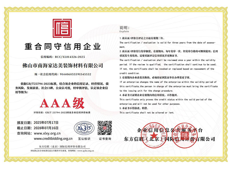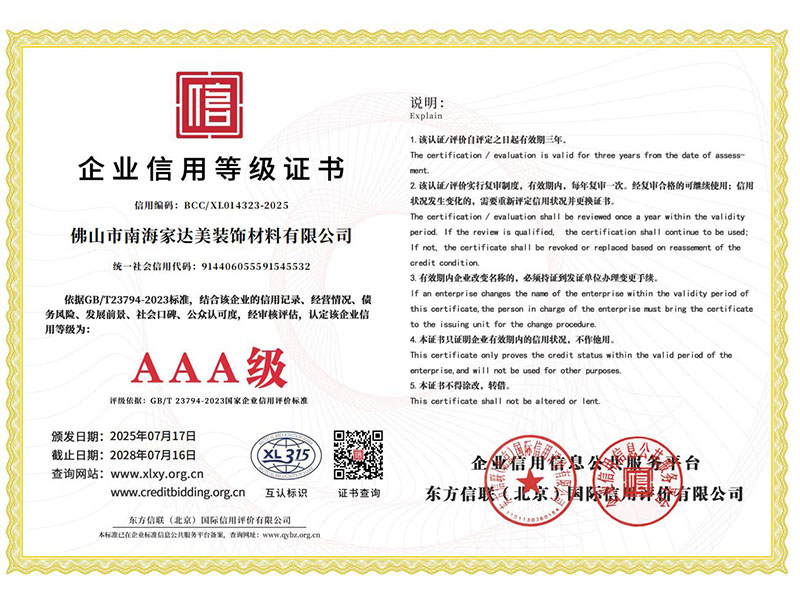 佛山南海家達(dá)美裝飾材料有限公司,成立于2001年,是一家集科研、設(shè)計(jì)、生產(chǎn)、銷售為一體的現(xiàn)代化PVC/PET裝飾膜、自粘膜,亞克力裝飾板的專業(yè)生產(chǎn)企業(yè),我們?yōu)槟愕娜菁揖颖砻嫜b飾提供一站式定制服務(wù),已獲得ROHS,REACH,ISO9001質(zhì)量管理體系等認(rèn)證,目前已遠(yuǎn)銷包括中東,中亞,東南亞國(guó)家等世界各地。